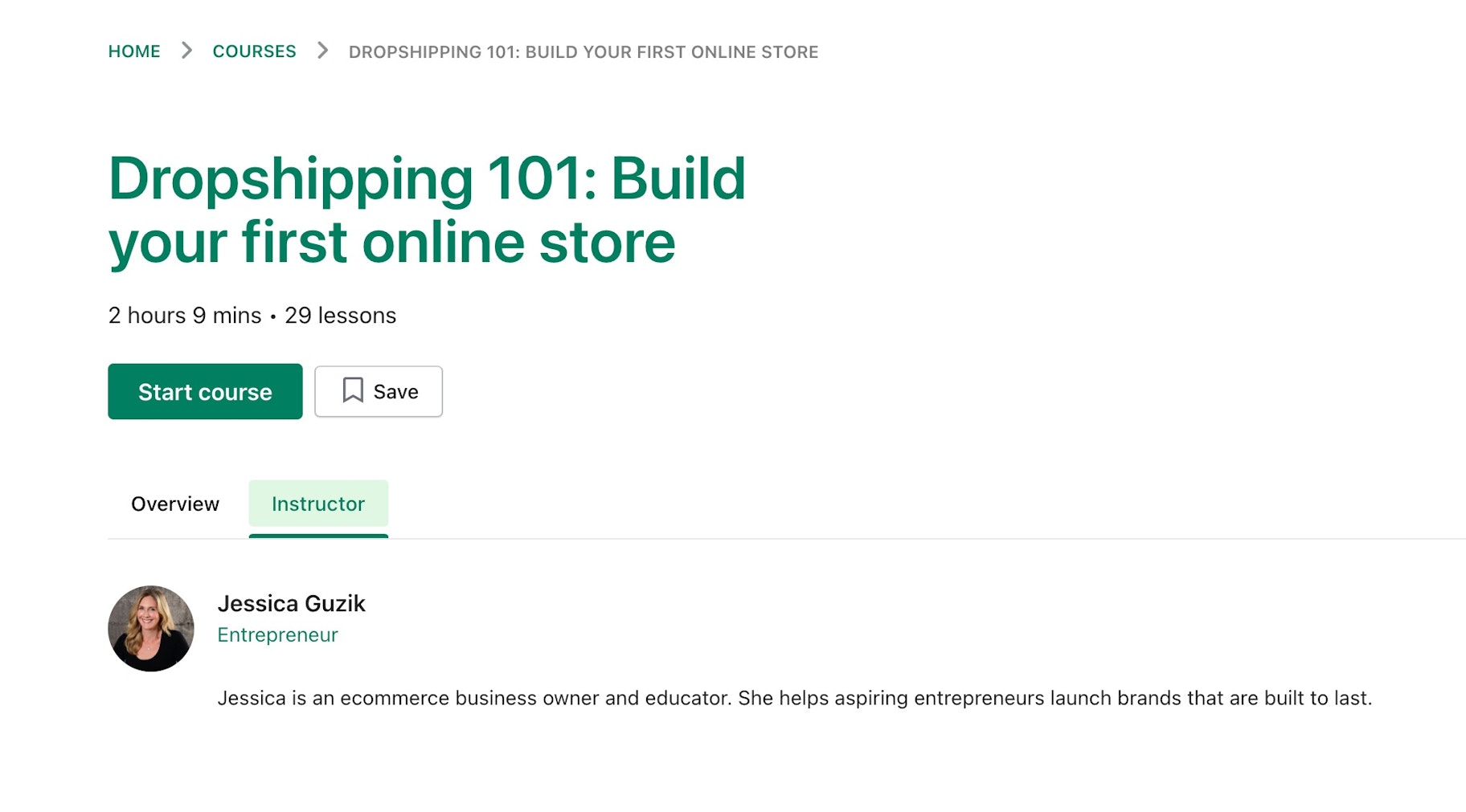 讲师杰西卡·古兹克(Jessica Guzik)在课程中包含了所有最好的提示、技巧和策略,这样你就可以利用它们,确保你的商店在竞争中脱颖而出。