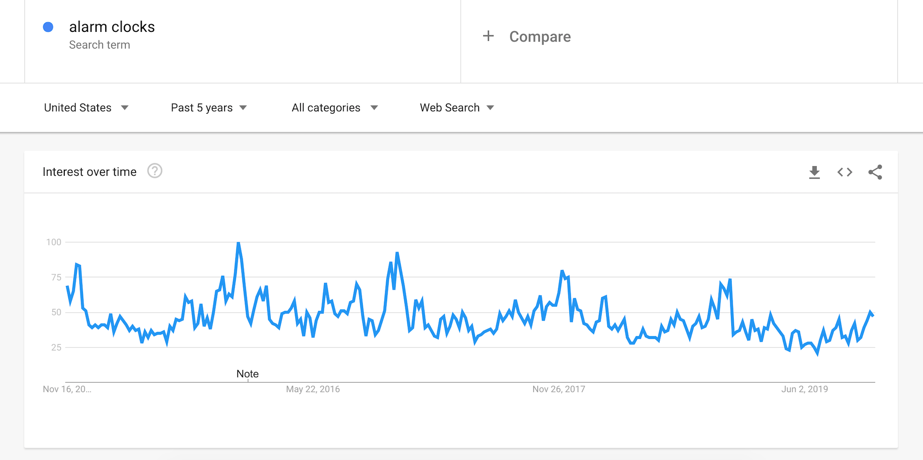 在过去的五年里,美国对闹钟的搜索量有所下降一个很少,但每年12月对这些产品的搜索量都会激增。