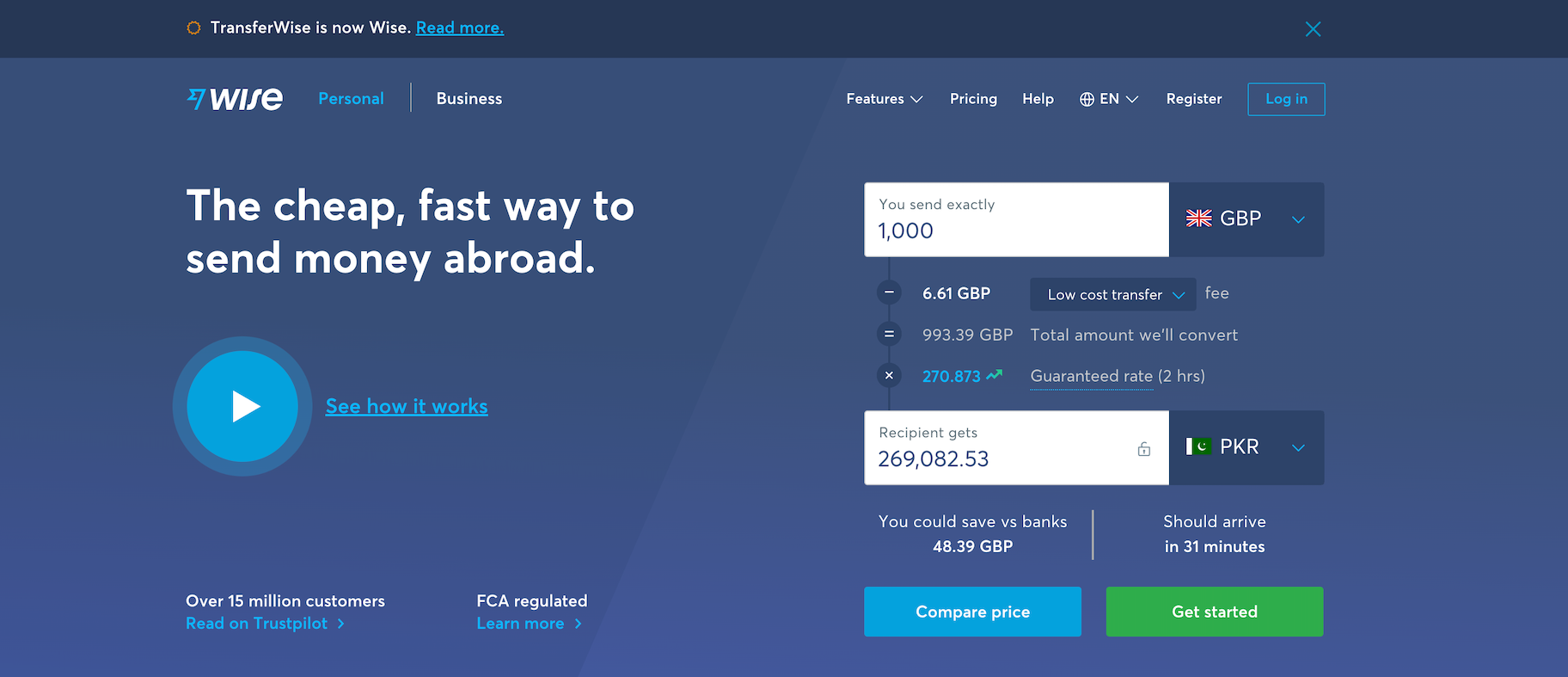 该支付解决方案声称提供“真实”汇率,而不会产生额外看不见的费用。在一笔2000美元的交易中在英国,Wise支付的费用比PayPal少106.47英镑。