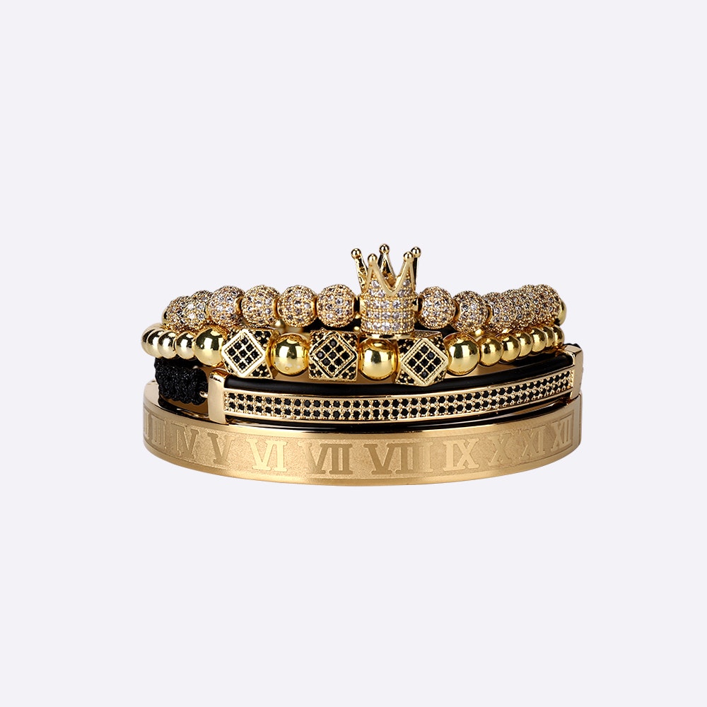 这款流行的男士魅力手镯以一套四个铜魅力手镯为特色,镀金,镶有立方氧化锆宝石。