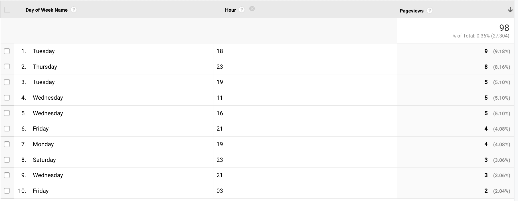 - 保存报告并查看结果。要查看一天中的小时,只需选择Hour作为次要维度。