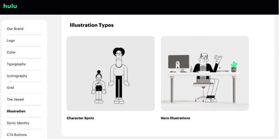 该公司还包括其插图风格的例子,这与它的个性相一致。平面设计师可以参考它来创造反映Hulu品牌的资产。