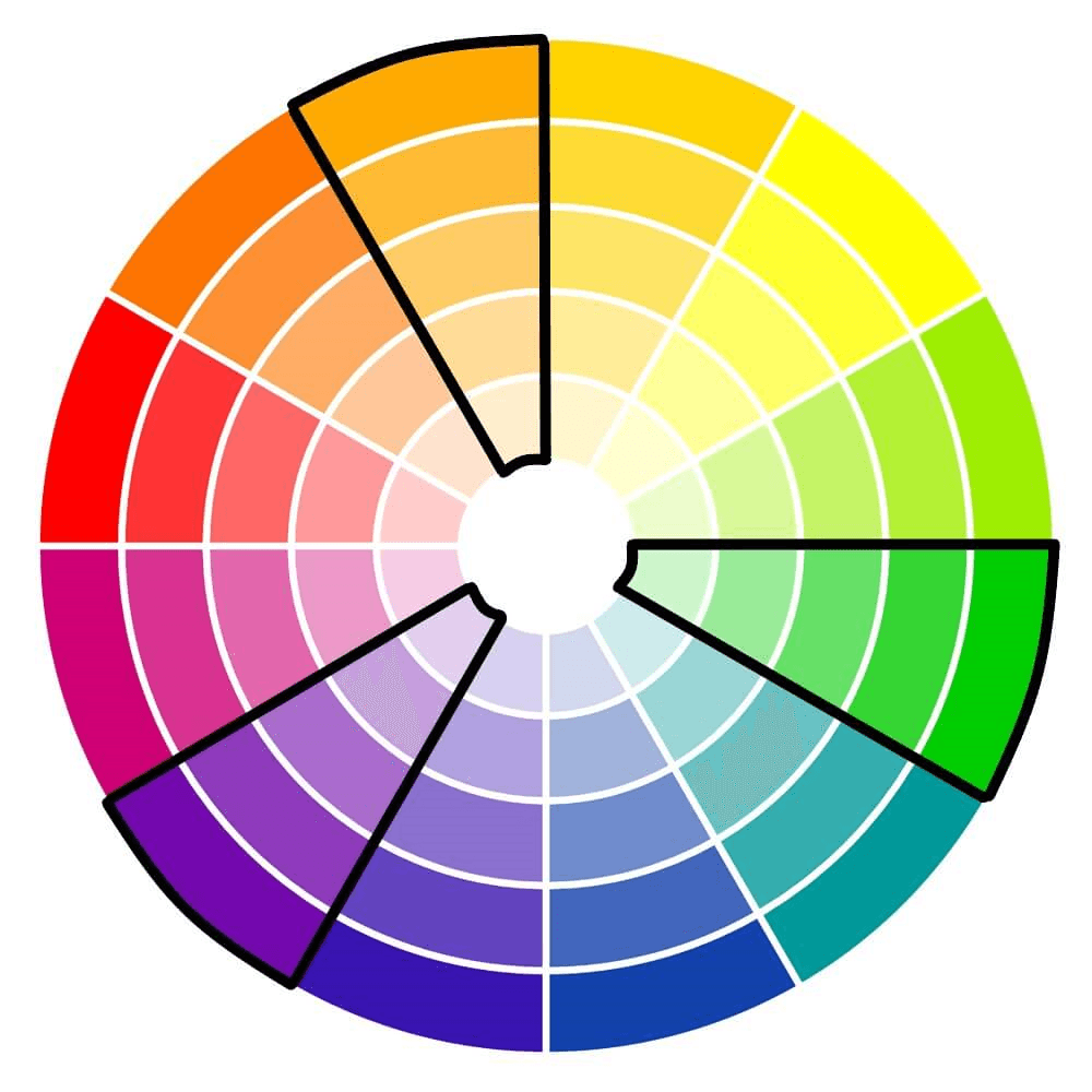 三色配色方案是分裂互补配色方案的变体。这幅构图中的颜色在色轮上的间隔是相等的。取一个等边三角形,把它放在色轮上。每个点上的颜色聚集在一起形成三色方案。