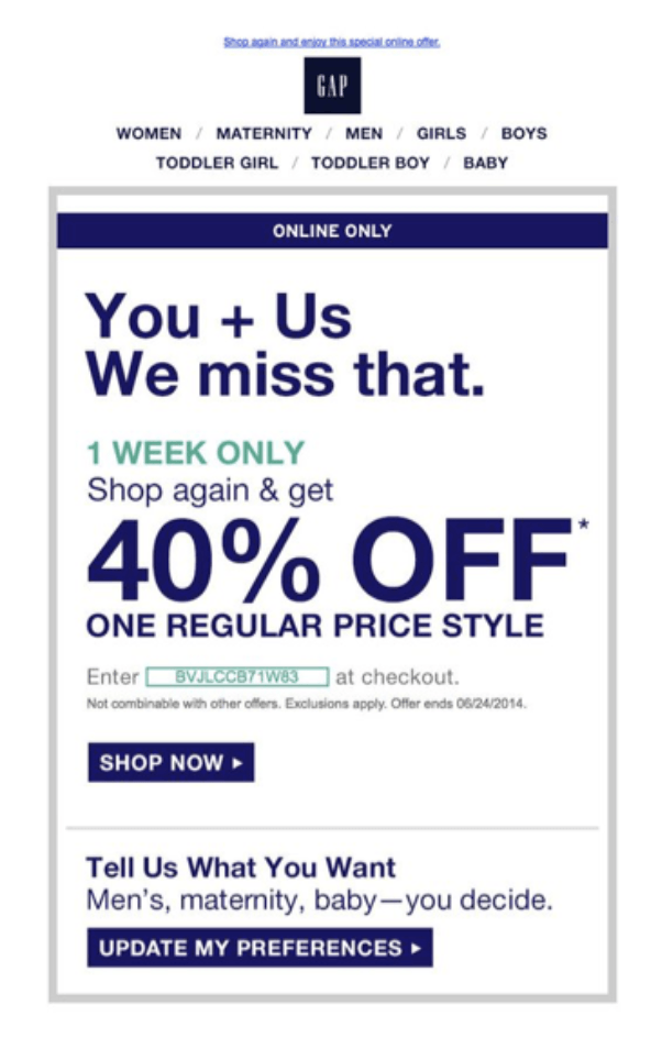 例如,服装零售商Gap在个性化客户体验方面做得很好。下面是他们发给老买家的邮件示例: