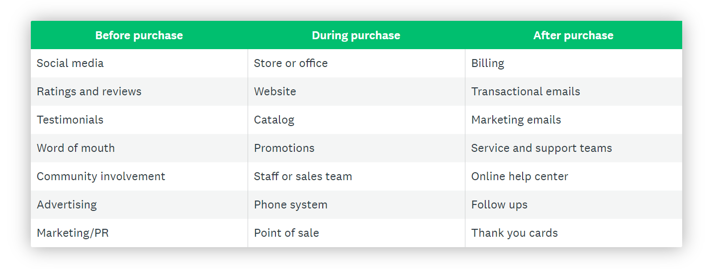 调查猴子在购买前、购买中和购买后的三个生命周期中,列出了常见的客户旅程接触点: