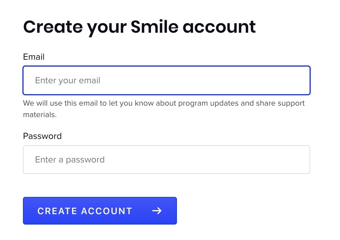 然后你需要通过输入你的电子邮件和密码来创建一个免费的Smile账户——我们建议使用与你的Shopify账户相关联的电子邮件。