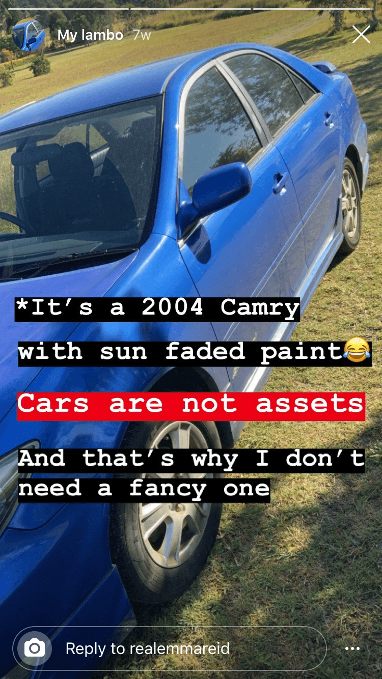 电子商务大师的世界很拥挤,但艾玛脱颖而出。在兰博基尼旁边摆姿势的大师的海洋中,艾玛自豪地展示了她自己的——一辆蓝色的2004年丰田凯美瑞,油漆被太阳晒褪了。“汽车不是资产,”她宣称。“这就是为什么我不需要花哨的。”
