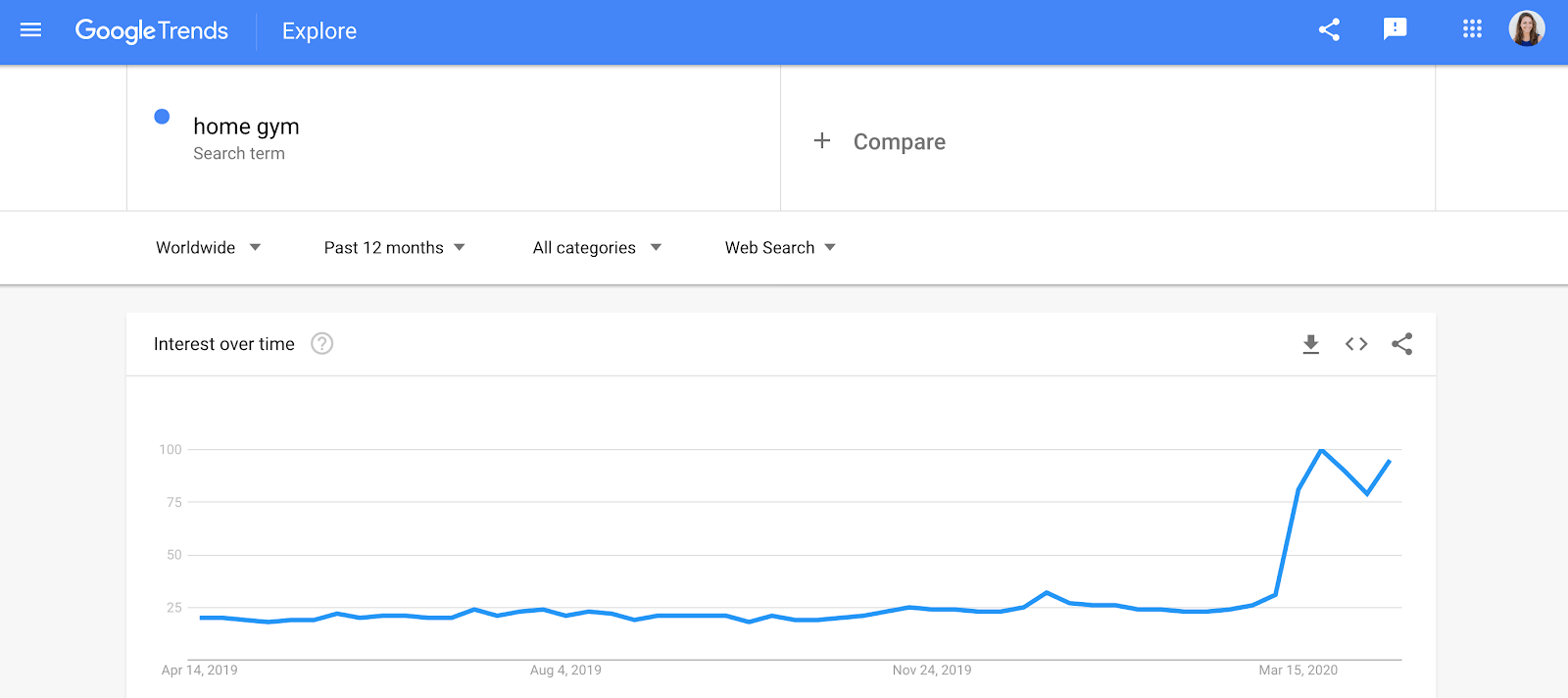家庭健身器材的需求可能会持续上升。快速浏览谷歌Trends就会发现,“家庭健身房”的搜索量比过去五年飙升到了更高的水平。