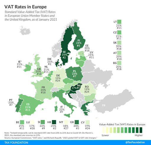 在欧盟,每个国家都有自己的增值税税率。