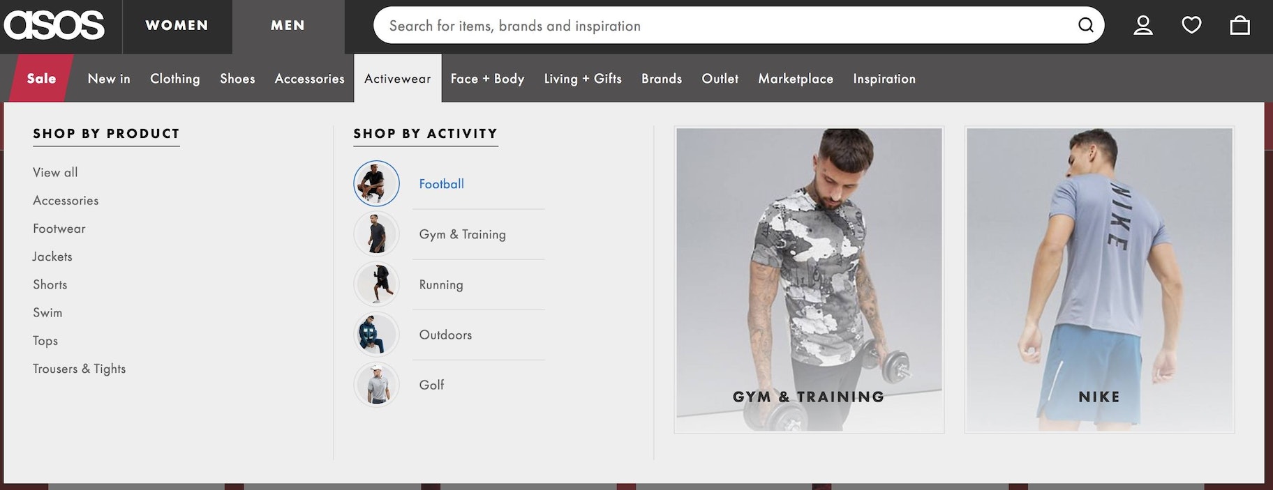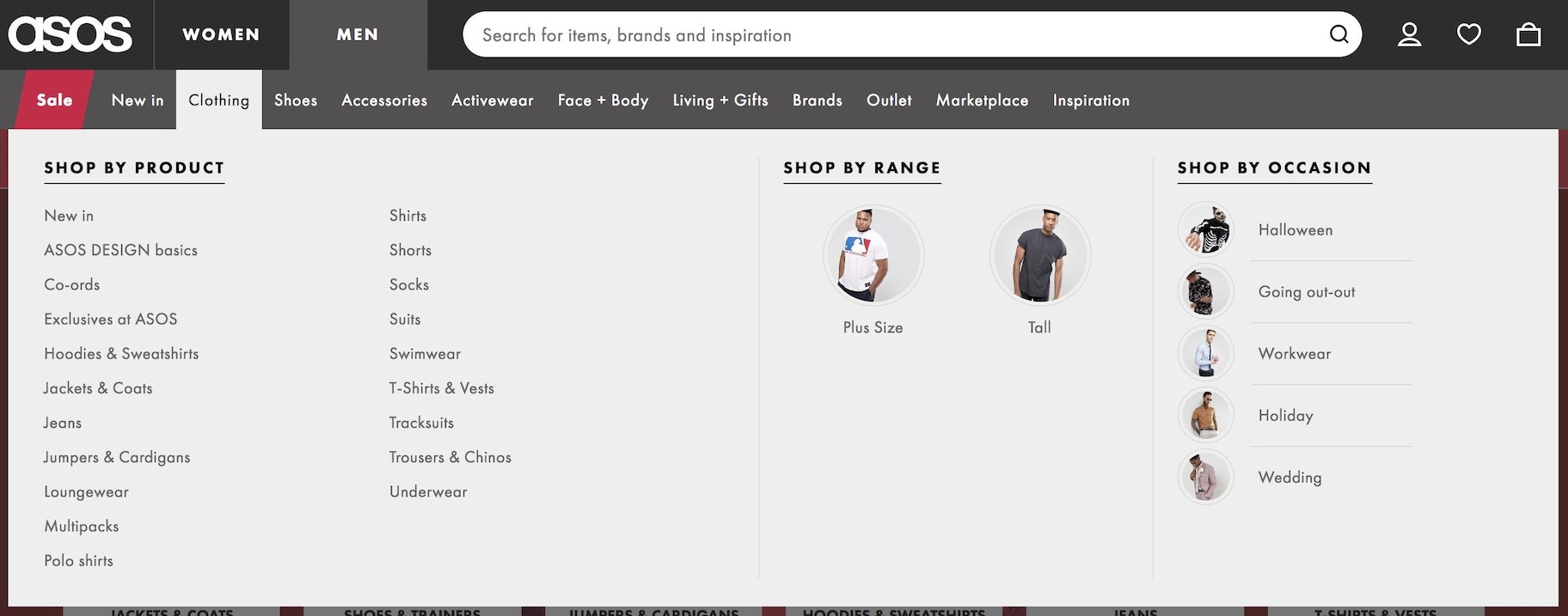 ASOS使用大量的类别和子类别来清楚地定义他们所销售的产品类型。