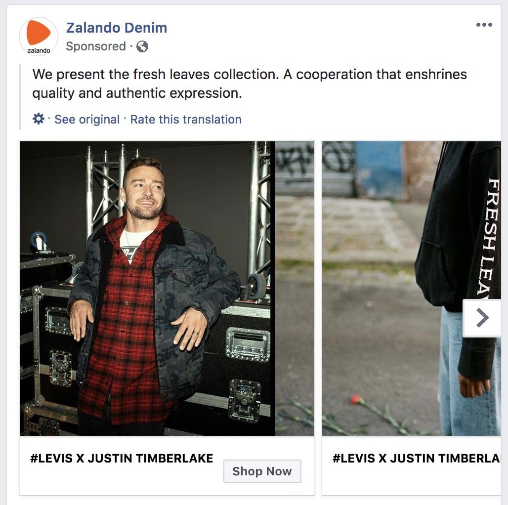 Facebook的广告指引我去了一个策划的收藏页面它突出了Levis和Justin Timberlake合作的许多产品。