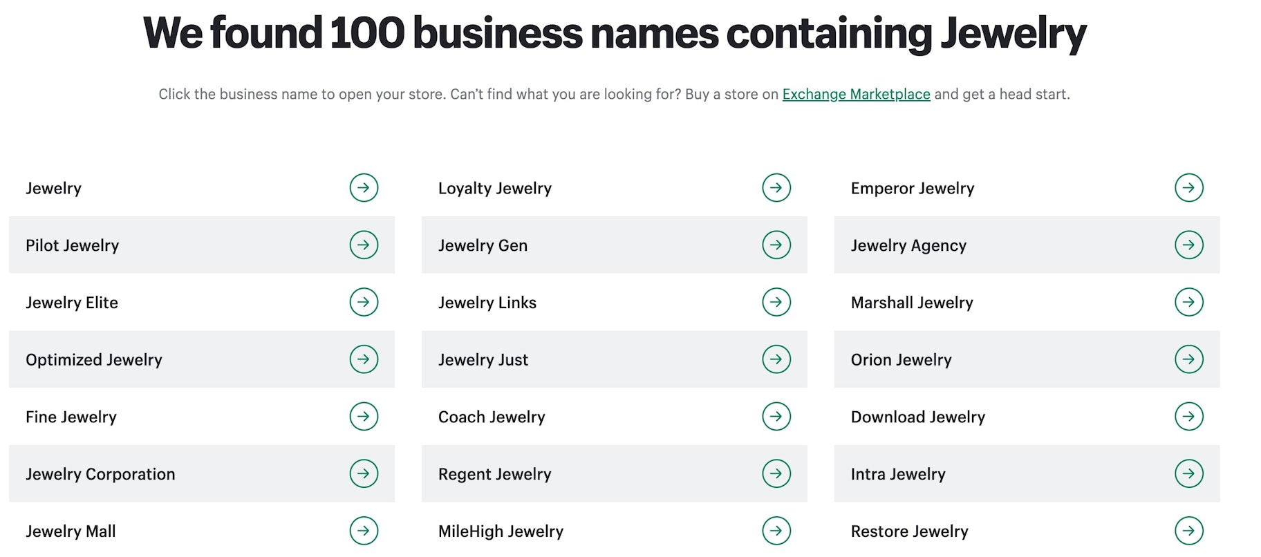 想出电子商务商店名称的一个有用的工具是Shopify企业名称生成器.你可以在你的电子商务商店名称中添加一个或两个关键字,它会为你提供推荐。然后,您可以简单地滚动选项,选择您想要的企业名称,并启动您的企业。
