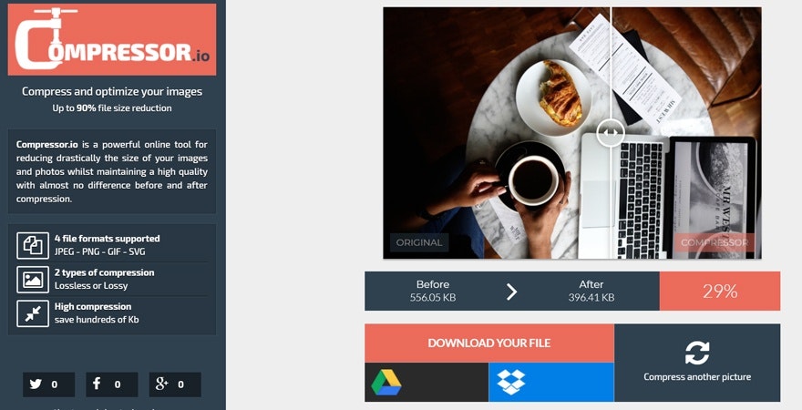 Optimizilla和Compressor.io是另外两个伟大的在线图像压缩工具。Optimizilla允许您压缩多个图像,而Compressor。IO每次压缩一个。