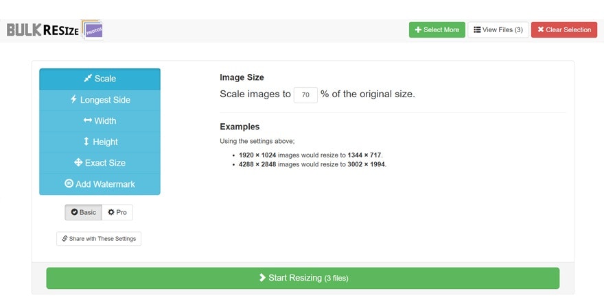 Bulk Resize是简单易用的。菜单在屏幕的左侧,屏幕会根据你的选择而改变。选项包括按百分比缩放,最长边,宽度,高度和精确尺寸。