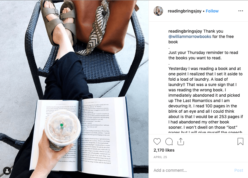 Instagram网红营销在较小的细分市场也很有效。算账阅读带来快乐这是一个由一个人运营的账户,每篇帖子都会获得数千个赞。每当她发布她正在阅读的一本书时,她的粉丝肯定会去看看,这种关系很适合网红营销。