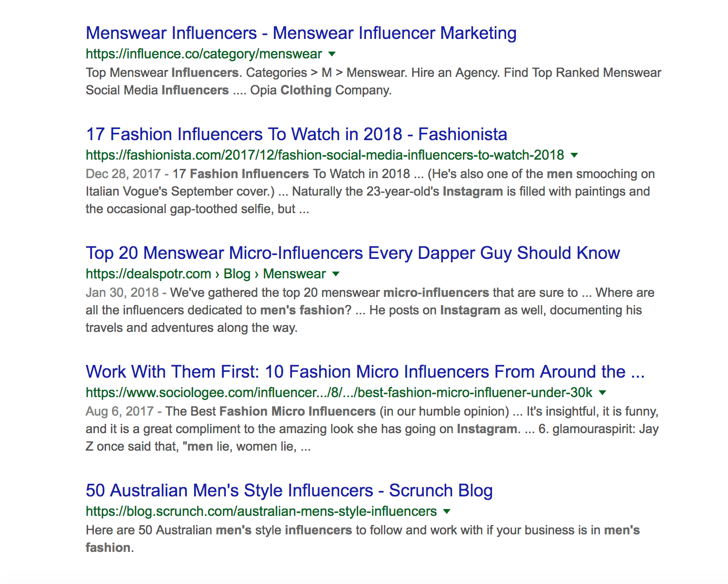例如,如果单击列表中的第三个结果-每一个衣冠楚楚的男人都应该知道的20大男装微影响力人物-你去Dealspotr。该网站为你提供了这一细分市场的Instagram网红名单。