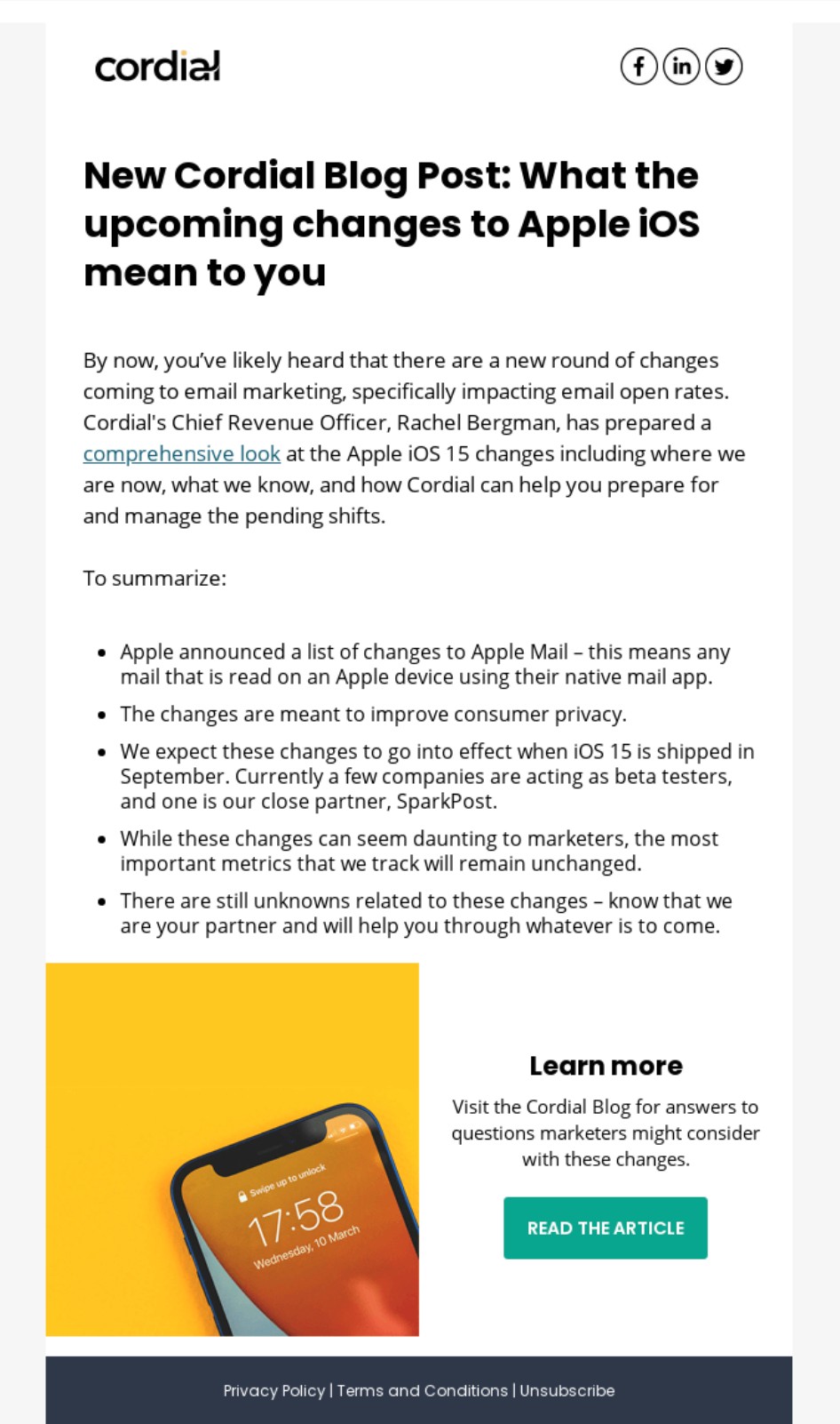 你也可以在电子邮件通讯中宣传你最新的博客文章。在这个例子中,跨渠道营销平台诚恳向订阅者发送关于它最近发布的新博客的消息。