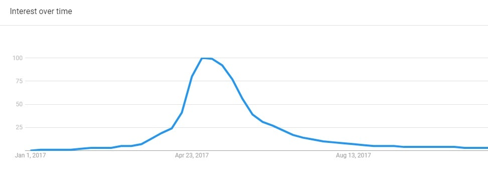 让我们来看看“指尖陀螺”这个搜索词。我们都知道这些是什么,我们也知道受欢迎程度的起起落落相当快。由此产生的图表向我们展示了这个项目受欢迎程度的上升和下降的一个非常明确的例子。