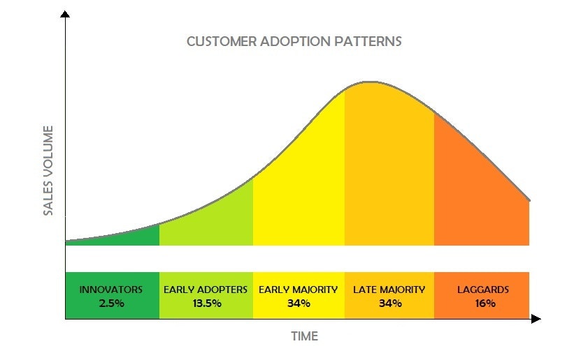 在早期多数之后是晚期大众.与之前的群体相比,这一阶段的采用者更加怀疑,他们的金钱和社会地位更低。他们还非常依赖可靠的产品,通常不会冒险购买。后期的大多数代表了另外34%的用户。
