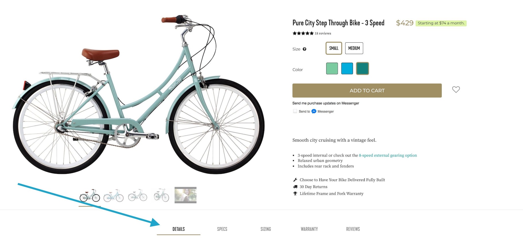 Pure Cycles产品页面的其余部分非常漂亮。Pure Cycles将客户评论、照片、社交媒体插头和运输细节加载到它上面——这些东西肯定不适合放在旁边添加到购物车按钮。