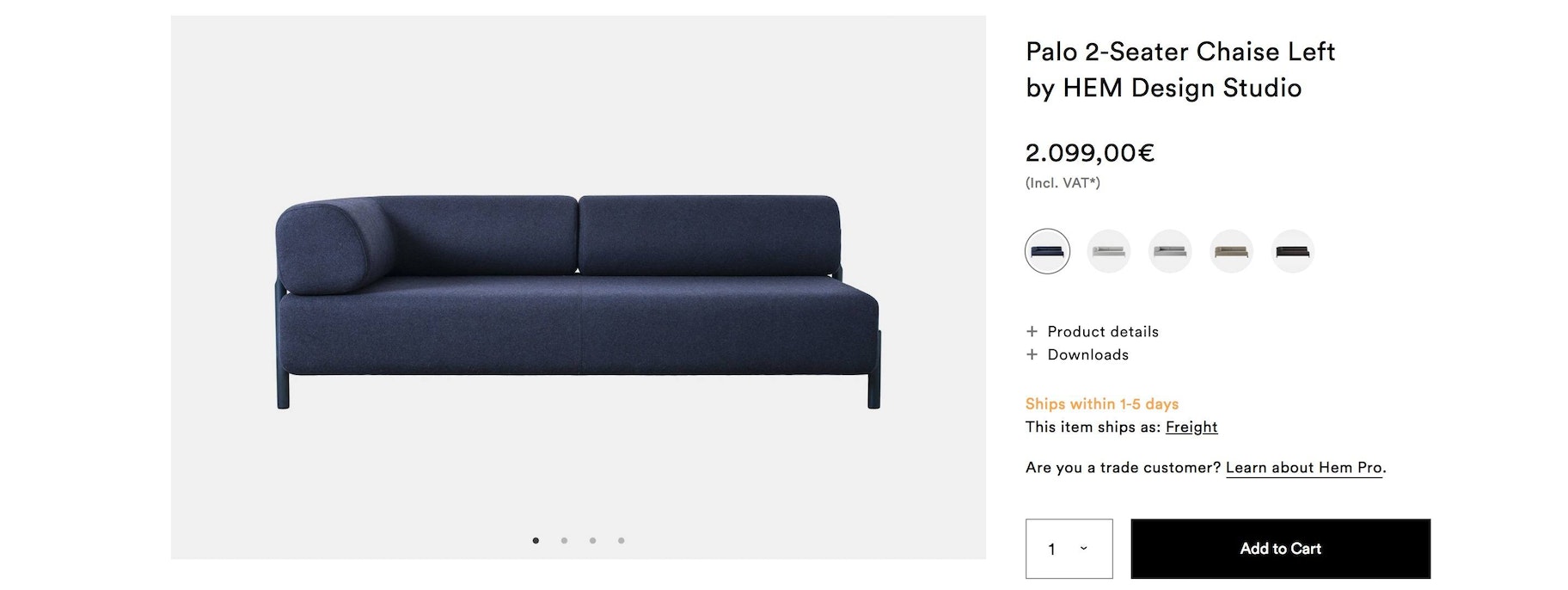 下一个是北欧家具品牌哼哼。Hem采用了一些聪明的策略,将产品页面变成一种完全属于他们自己的体验。