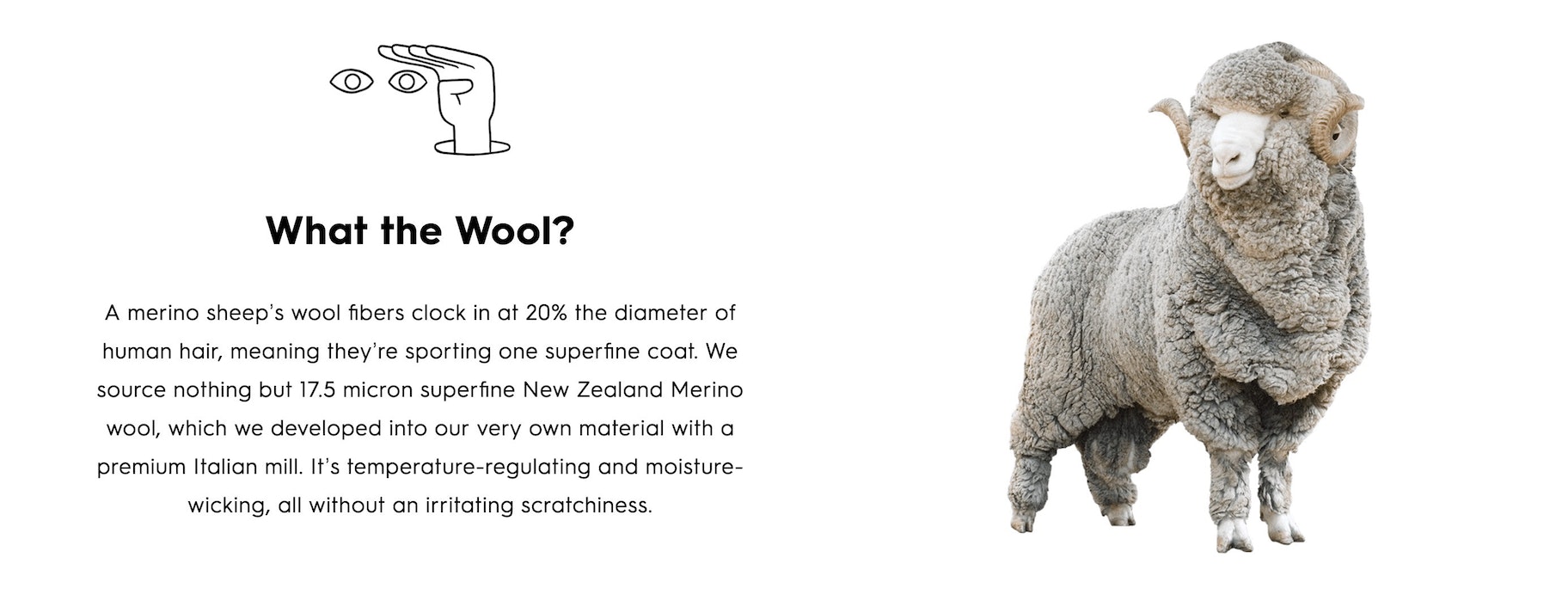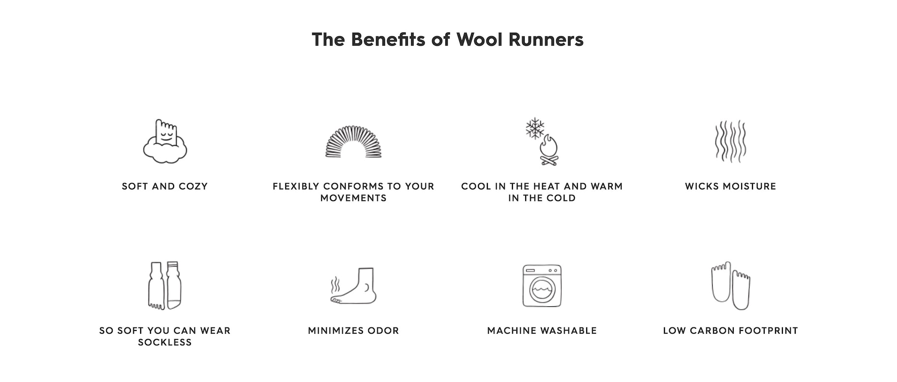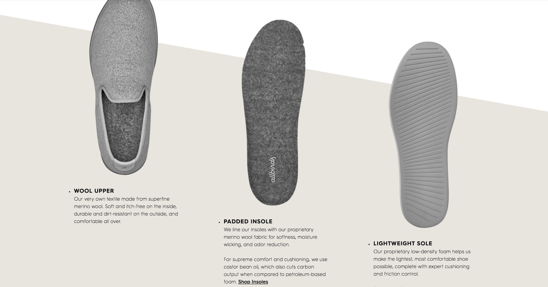 这里有很多值得拍马屁的地方。首先,Allbirds坚持“形式服从功能”的古老格言。也就是说,他们有一个产品描述,在提供的空间,旁边的特色图像,没有破坏对称的布局。