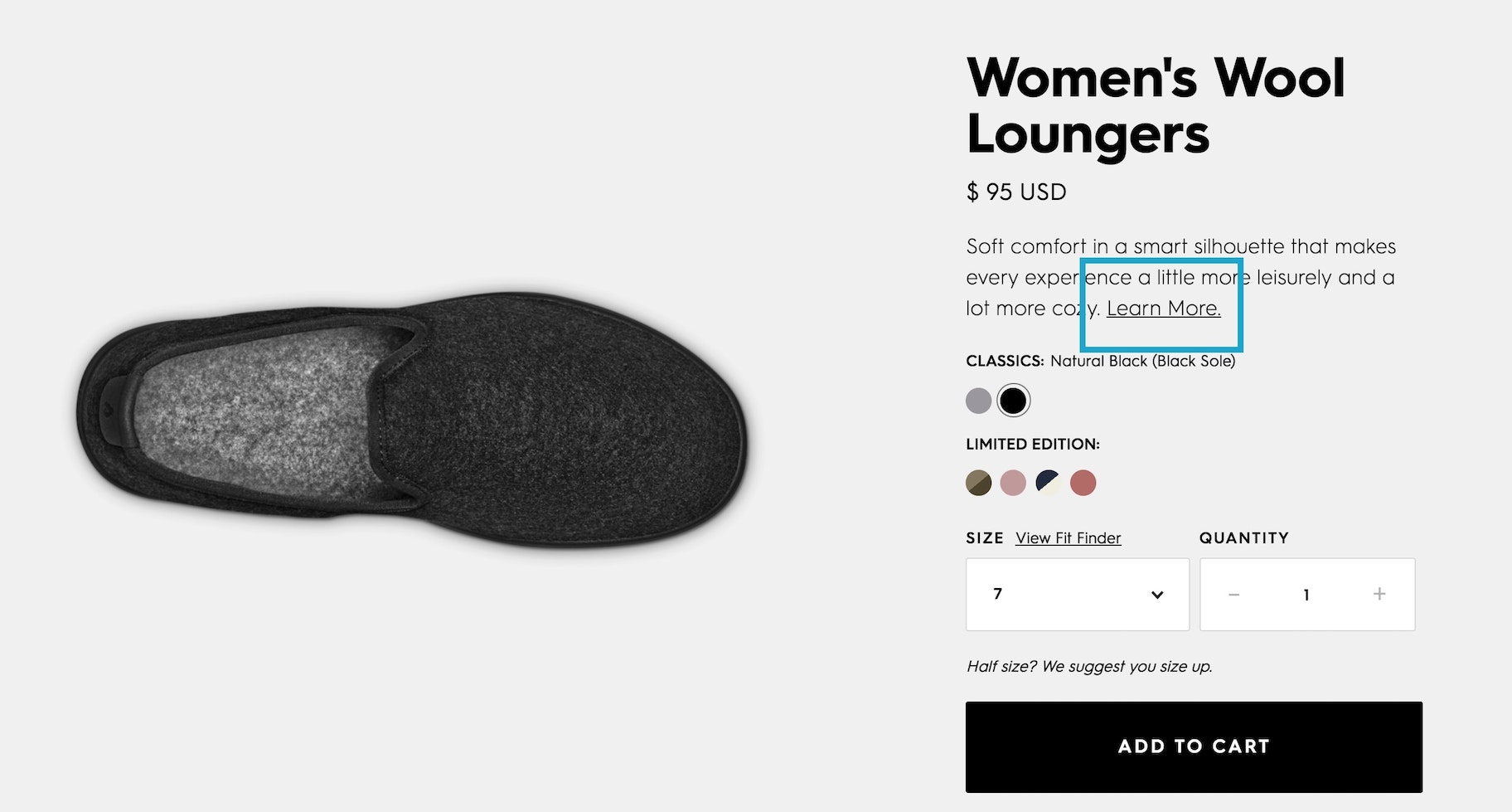 销售鞋子的Allbirds创建了我们上面看到的产品页面。你知道的,就是看起来正常的那个。