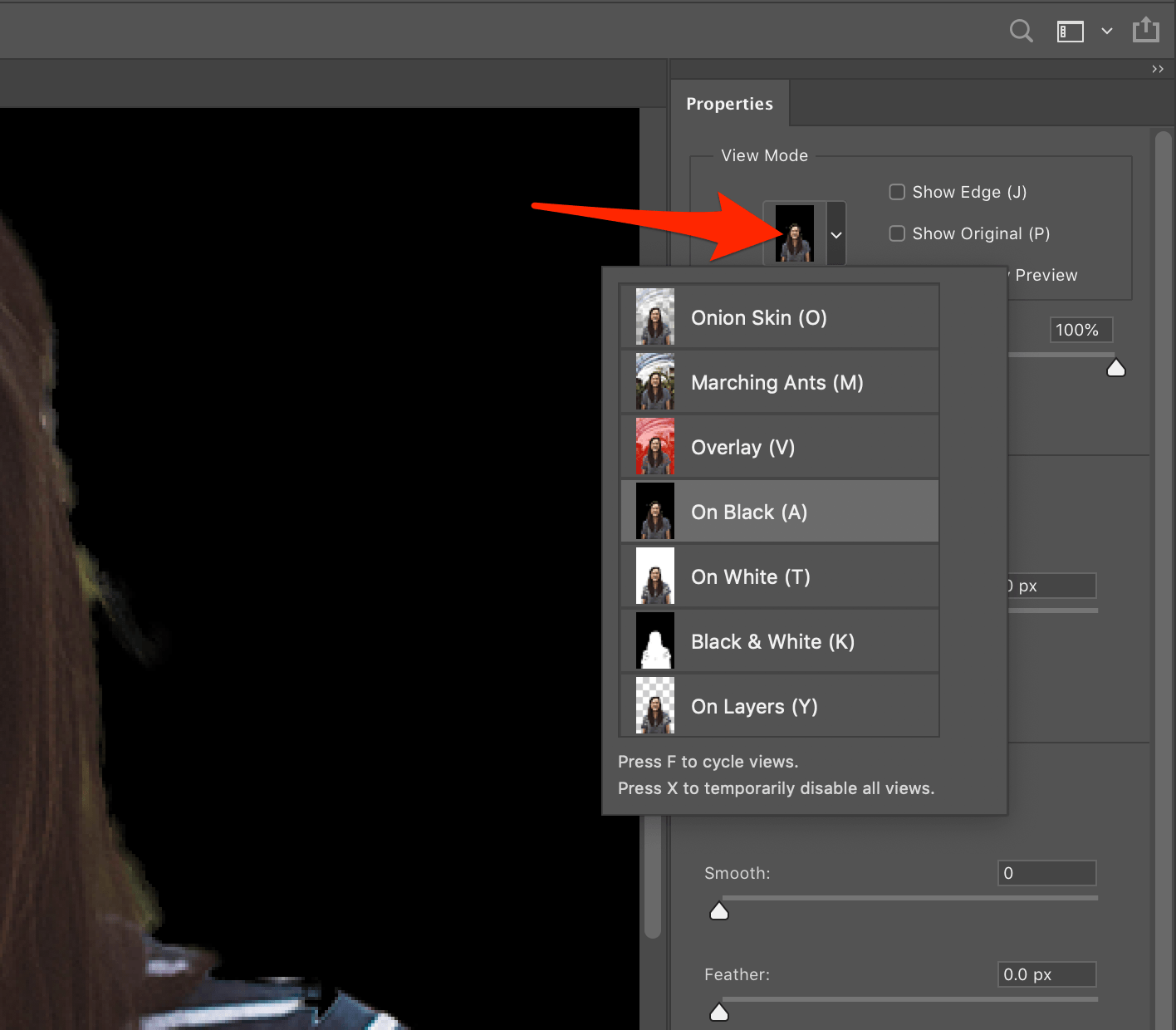 At this point, you’ll need to thoroughly check your selection. To do this, change the view setting to “On Black.”