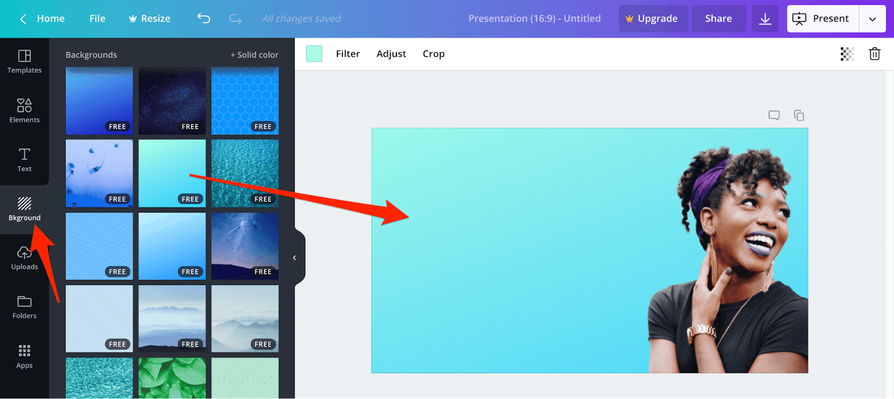 The easiest way to change a photo background in Canva is to click “Background” in the left-hand sidebar and select one of the premade backgrounds.