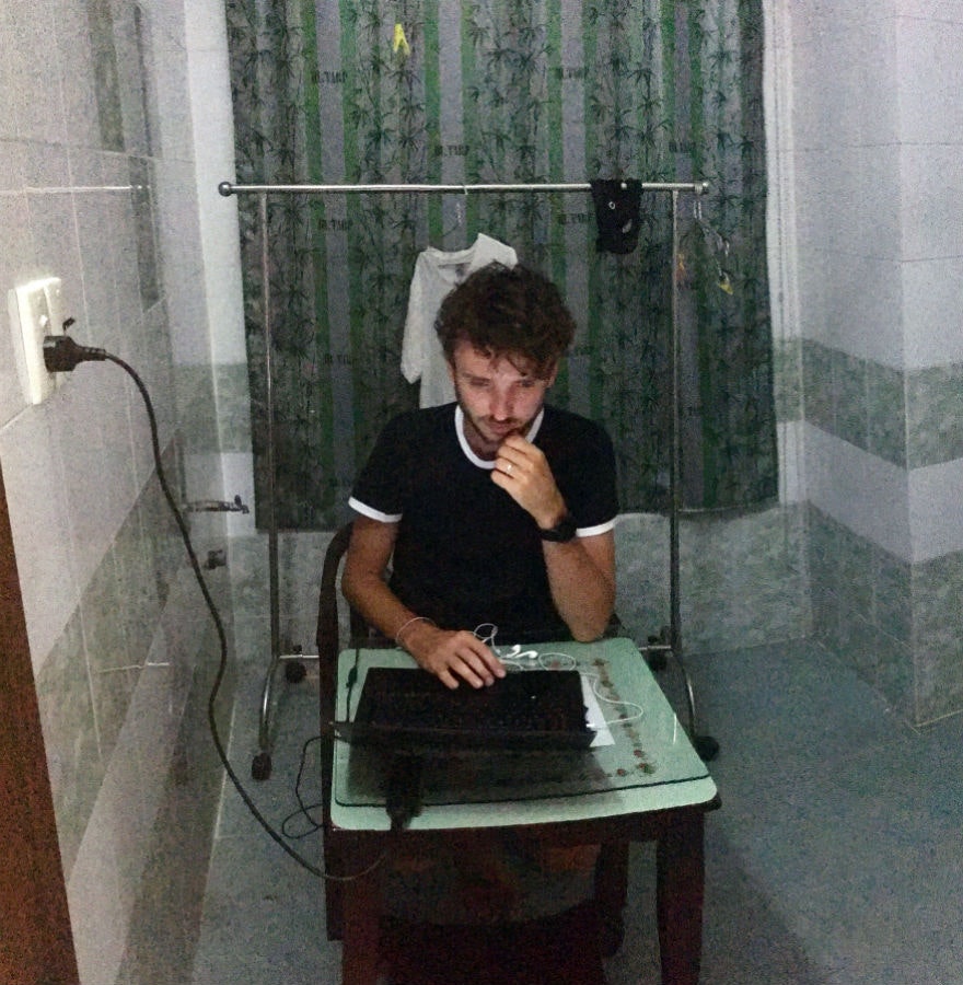 在越南胡志明市,面对一个重要的Skype电话,他被迫在酒店的小浴室里搭建了一个临时工作站——这是整个房间里唯一一个有可靠互联网连接和工作电源插座的地方。