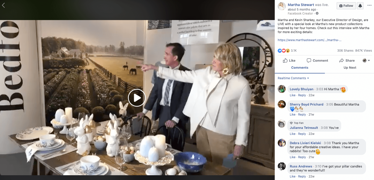 玛莎·斯图尔特(Martha Stewart)经常使用脸书直播(Facebook Live)与她的产品线相关的内容。在这些视频中,她经常烹饪,分享技巧,带观众去幕后观看。