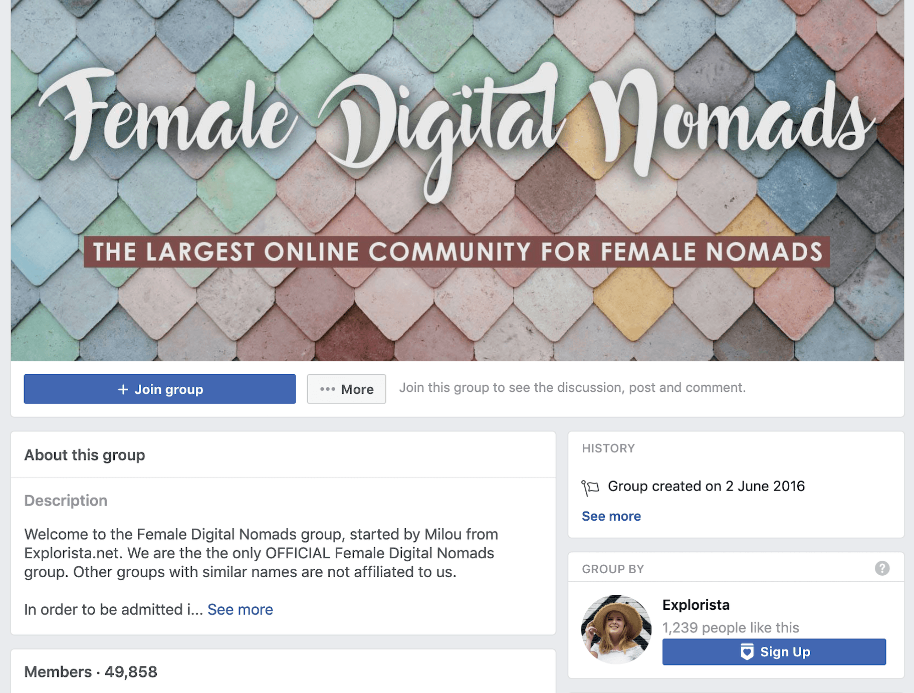 你可以加入女性数字游牧民在Facebook上建立小组,参与正在进行的讨论,并创建内容来帮助小组成员。