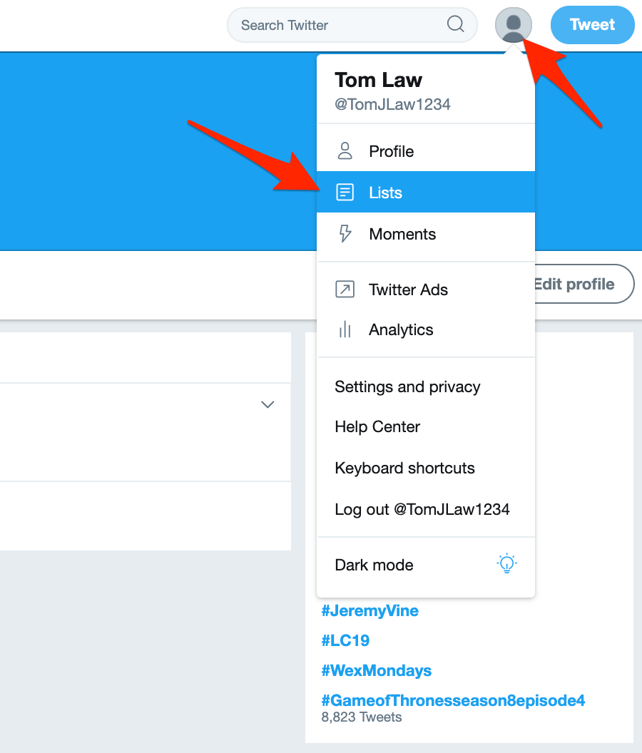 要在Twitter上创建私人列表,请单击您的头像,然后单击“列表”。