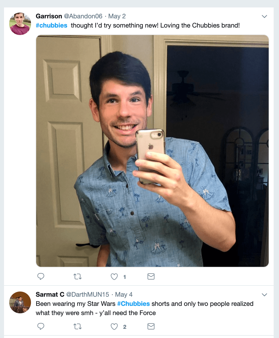 例如,服装企业Chubbies可以在Twitter上搜索“# Chubbies”标签,查看人们对他们品牌的评价,而无需标记他们的账户。