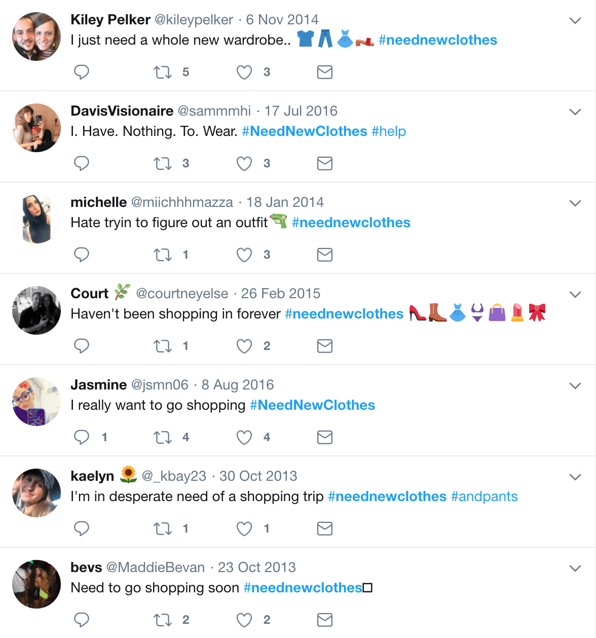 例如,说你卖女装在推特上搜索“#需要新衣服”只需要几秒钟就能找到一长串潜在客户。