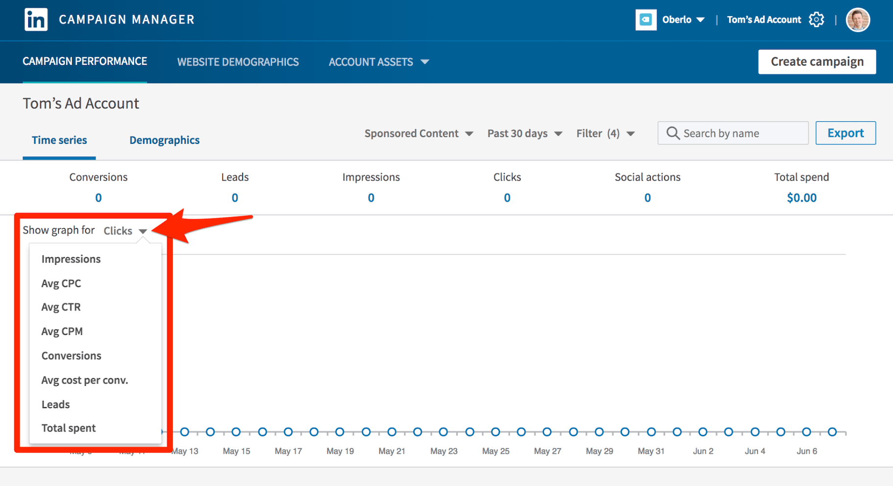 在这里,LinkedIn提供了一系列指标,你可以在各种图表中查看这些指标,以帮助你衡量和优化你的营销活动——包括印象、点击、转化和支出。