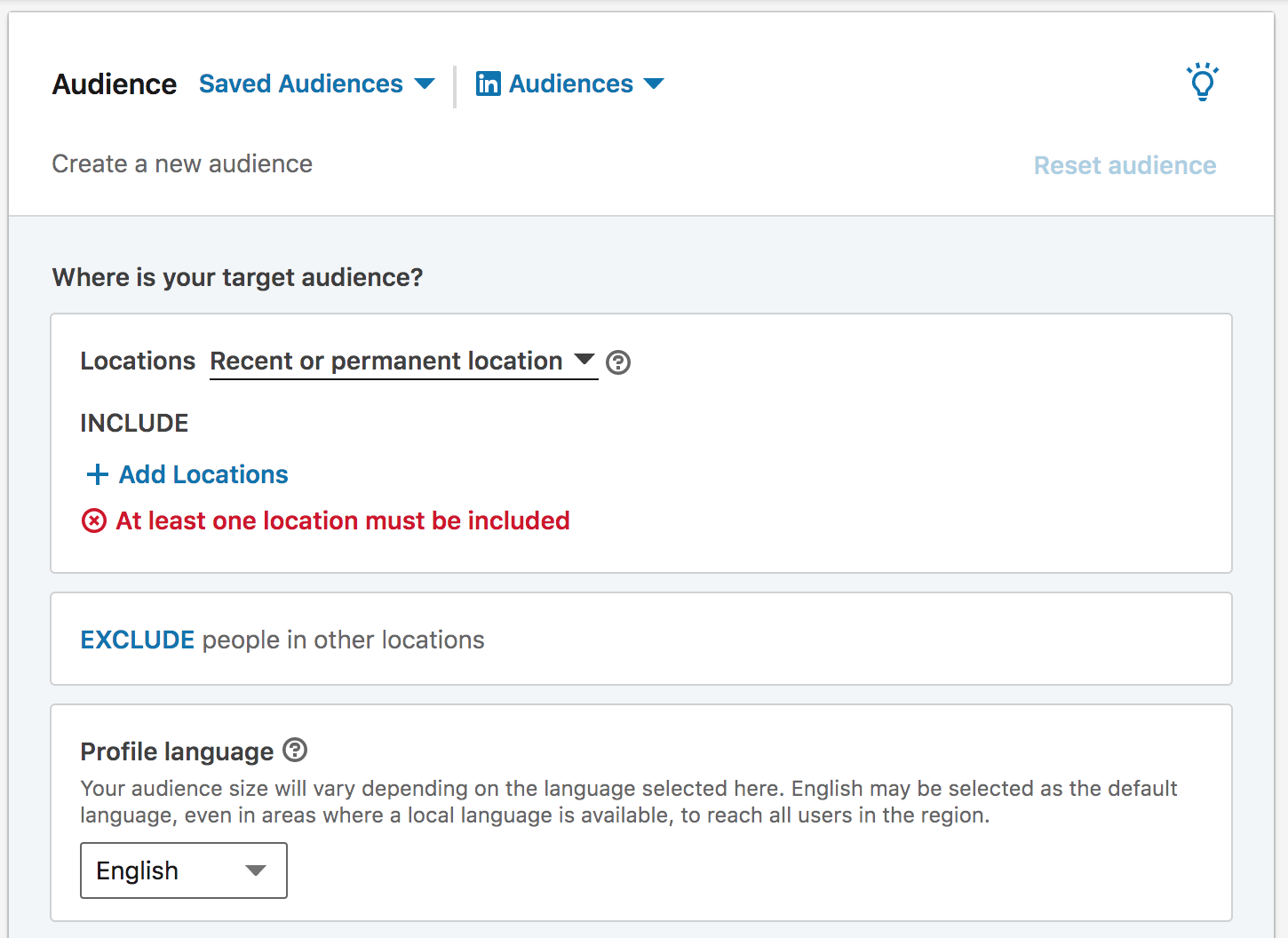从您自己保存的受众,预设的LinkedIn受众过滤器或自定义参数中进行选择。