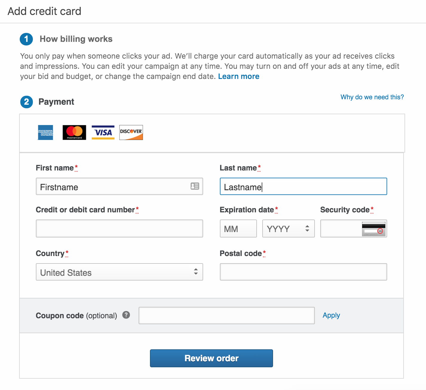 要完成LinkedIn广告的设置并开始您的活动,您需要输入您的付款详细信息。
