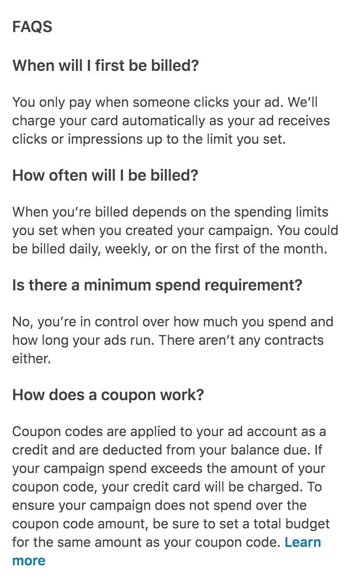 在这一点上,如果你有任何问题,LinkedIn Campaign Manager在支付表单旁边或下面有一个FAQ部分(取决于你使用的是什么设备):