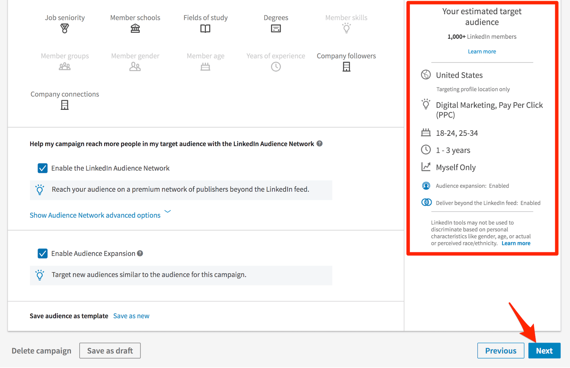 一旦你选择了你的受众,LinkedIn Campaign Manager会在侧边栏中总结细节: