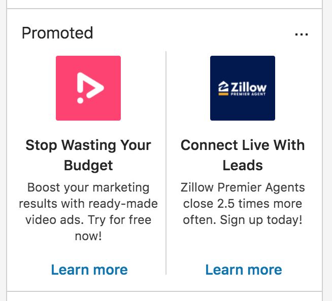 登录你的LinkedIn账户,看看右边的铁轨。你会注意到一个名为“Promoted”的部分。这些是LinkedIn的展示广告。