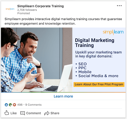 你也可以使用展示广告来推动更多的LinkedIn群组成员,并推广你的企业的LinkedIn页面来吸引更多的追随者,就像这个来自在线专业培训平台的例子Simplilearn: