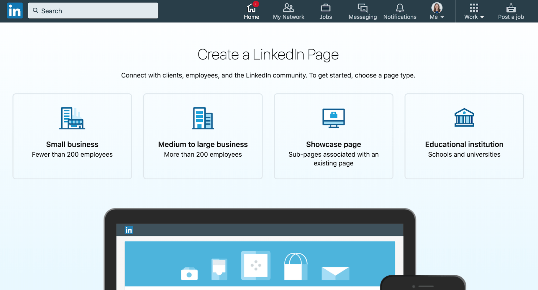 只需前往LinkedIn创建了一个公司页面,添加您的公司名称,首选页面URL,然后点击“创建页面”!