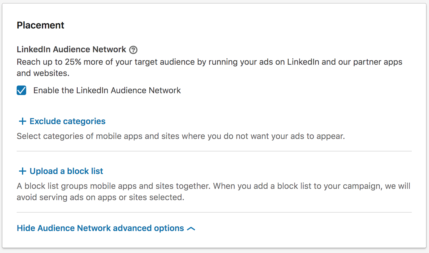 在广告格式选择下面,你也可以使用LinkedIn受众网络设置来选择你的广告位置。这将使你的广告出现在LinkedIn以外的其他网站、应用程序和平台上,以实现一致的跨渠道信息传递。