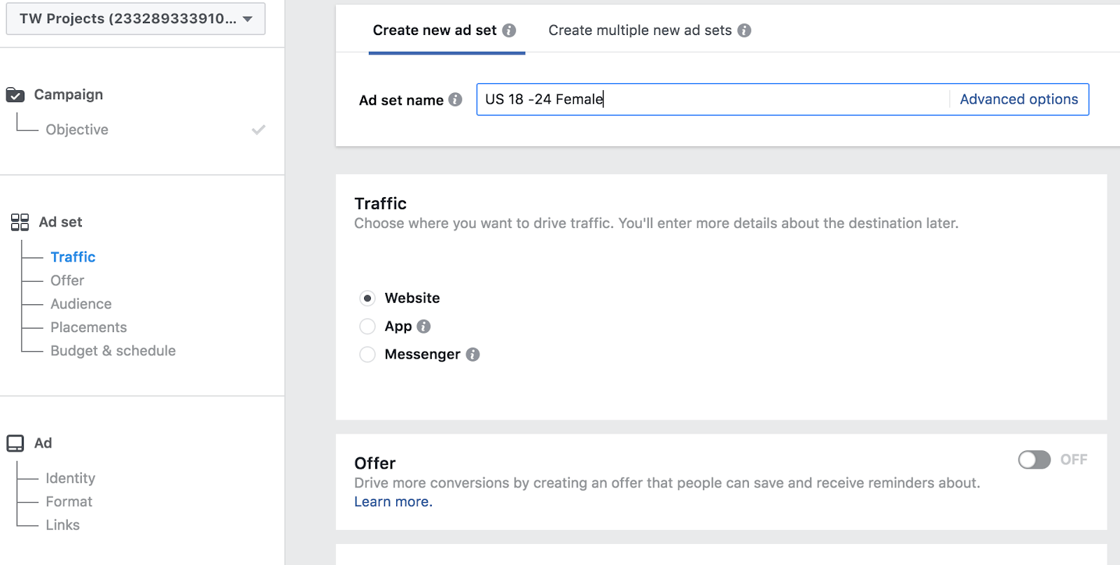 接下来,为您的广告集创建一个名称并选择网站作为我们想要驱动流量的目的地。离开提供暂时取消选举。