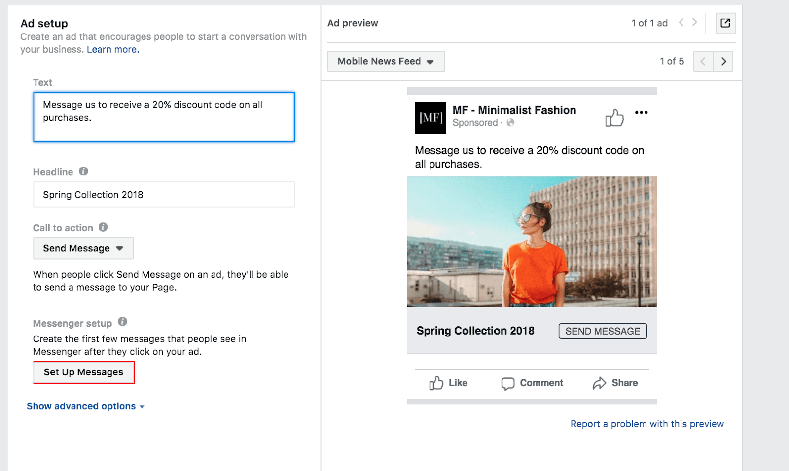 输入文本、标题并选择CTA。使用广告预览在启动广告之前检查广告.下面你可以看到我完成的广告在Messenger主屏幕上的效果。