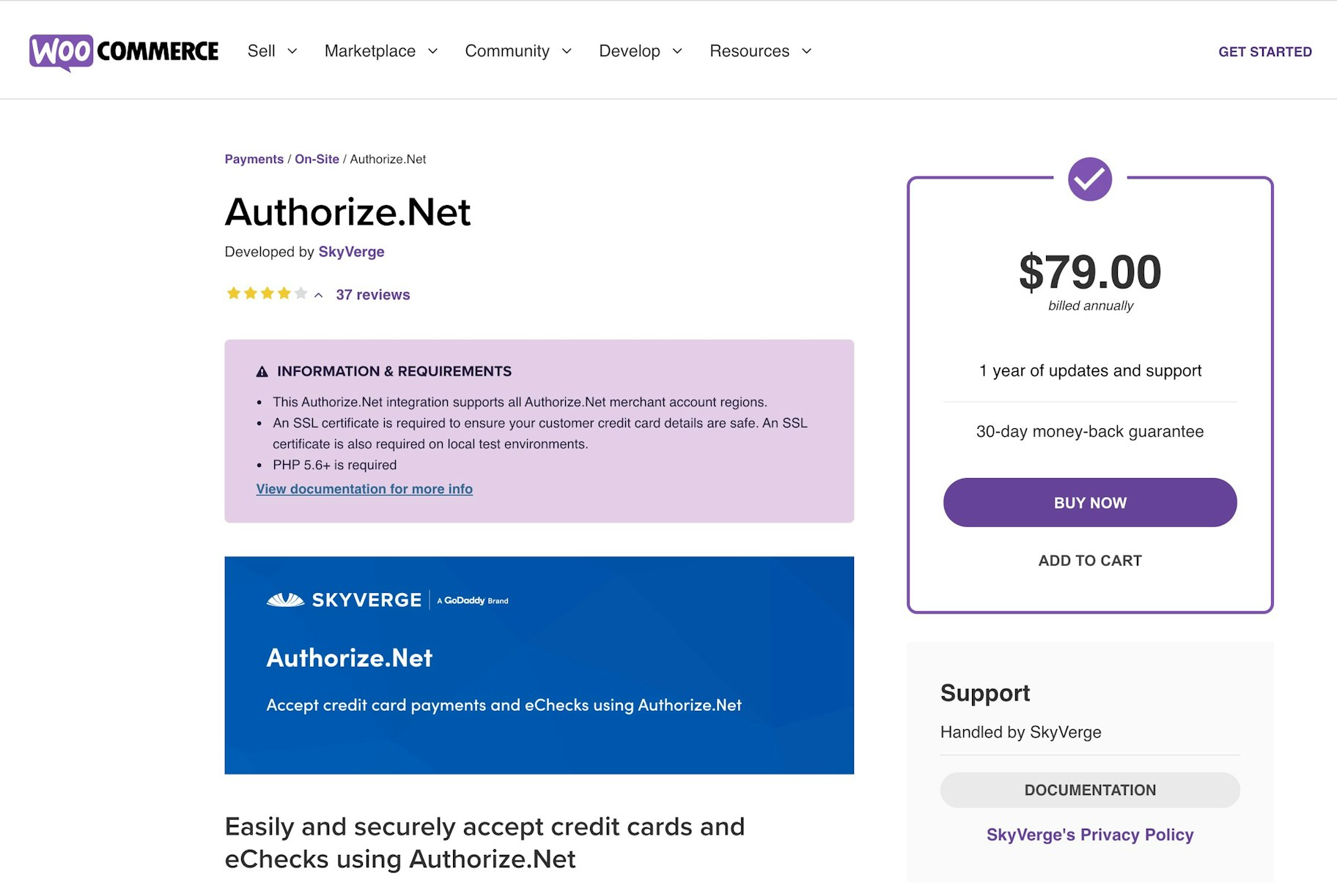 对于WooCommerce,该解决方案使用户能够免费将Stripe和PayPal集成到结账过程中。但是,它需要为Authorize.net和Braintree等其他选项提供高级扩展,每年的最低费用为79美元。