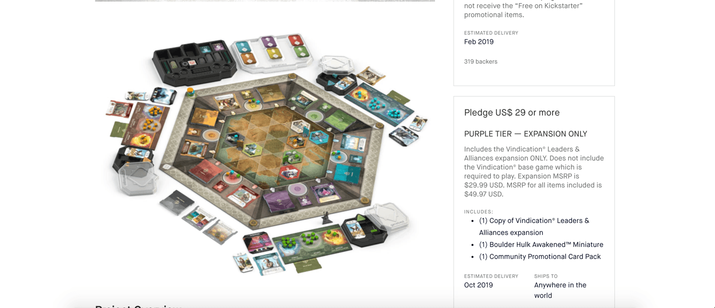 这款桌面游戏的创造者已经列出了几个级别的承诺,其中大多数都包括一个最低可行产品(不是整个包)。