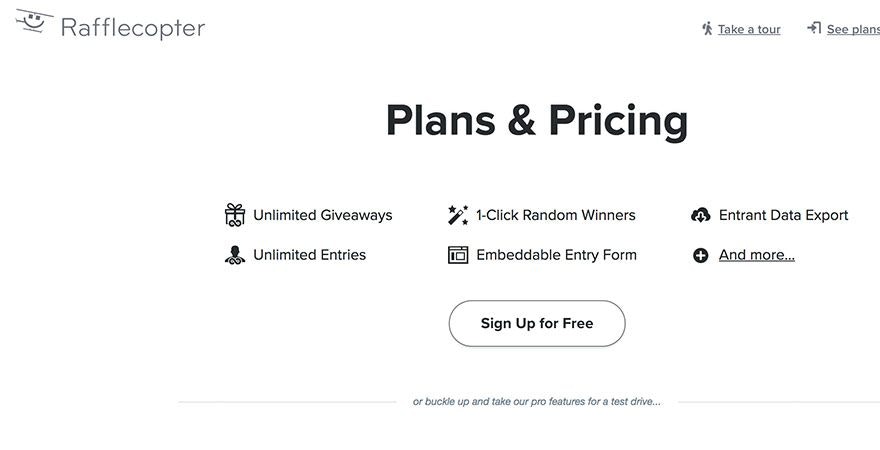 Rafflecopter当谈到举办比赛时,提供了完整的包。他们的高级套餐为顶级电子邮件提供商提供电子邮件集成,社交媒体条目,朋友推荐条目,分析,无限赠品等。他们的工具有一个免费版本,功能有限,非常适合初学者。