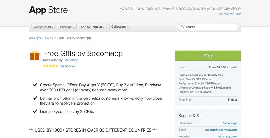 Secomapp赠送免费礼品是一个伟大的应用程序的追加销售,但也给你的客户津贴。你可以提供买一送一的交易(BOGO),花X美元免费赠送礼物,或者在购买某些产品时提供其他产品的折扣。